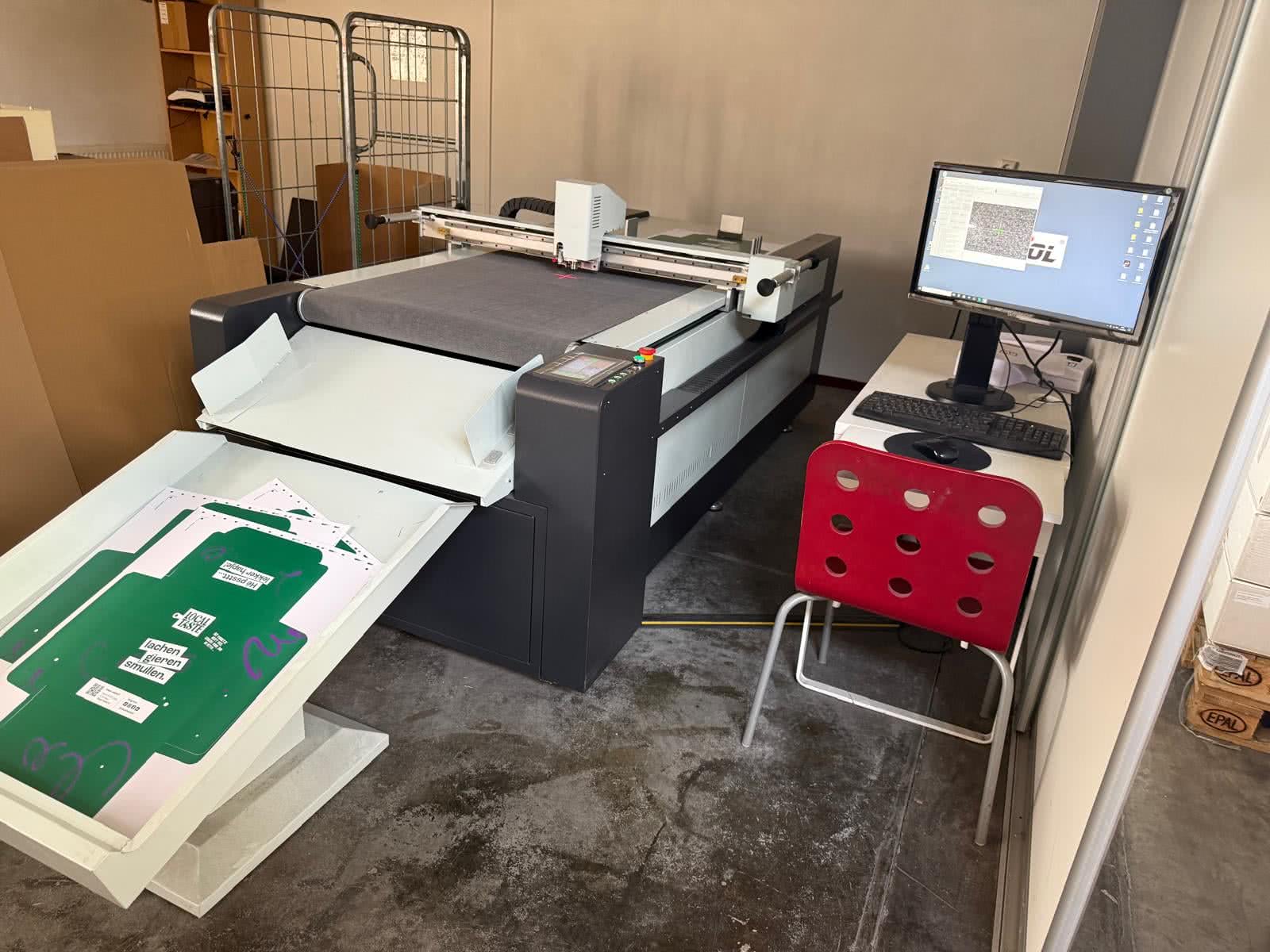 The AOL-1070 Cutting Flat Plotter, serial number 8473, is a multifunctional cutting system designed for precision and versatility in packaging, signage, and prototyping applications. With a working area of 700 x 1000 mm, this unit offers a compact footprint while delivering robust performance. Equipped with a multifunctional tool holder, the plotter features oscillating blades for clean and accurate cuts across a variety of materials. Additional tooling includes train inlet meters for controlled material feed, folding wheels for creasing operations, and a pen for labeling, making it suitable for complex workflows that require cutting, scoring, and marking in a single pass.