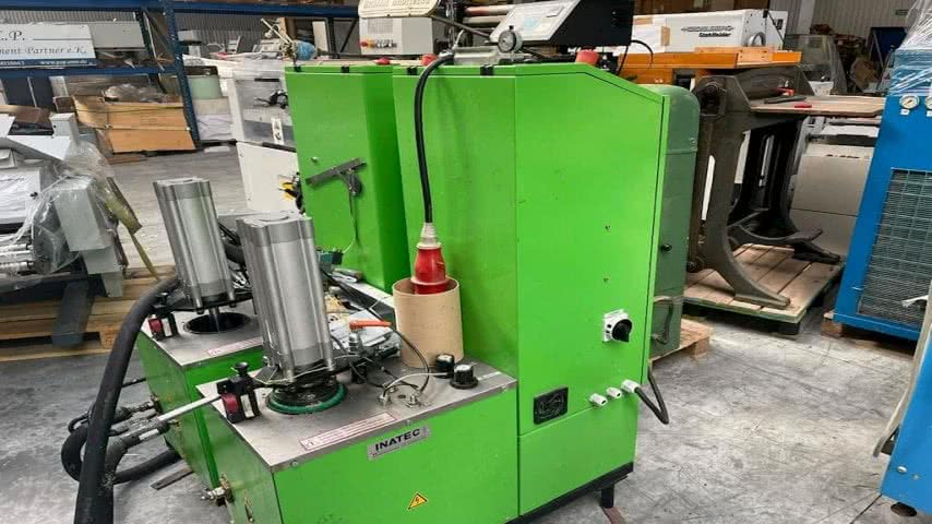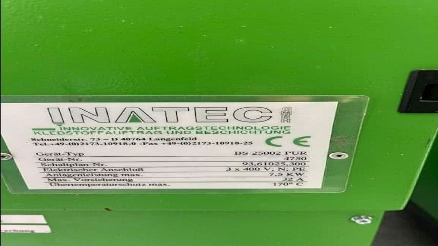 • INATEC BS 25002 PUR is a machine manufactured by INATEC. Currently stored in Germany, it is a PUR adhesive unit in good condition with a maximum system output of 7.5 kW and over-temperature protection up to 170°C. The delivery terms are FCA.