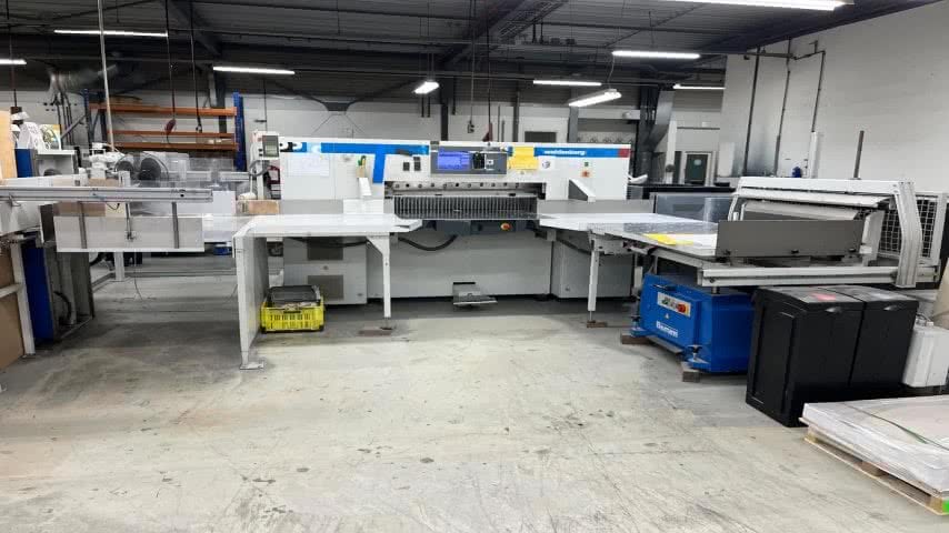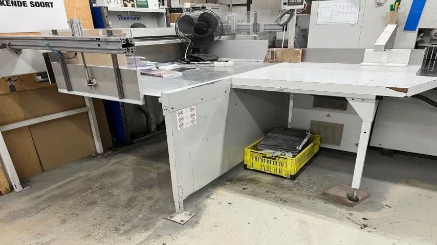 • This Wohlenberg 115 paper cutter, manufactured in 2005, is currently located in Germany and remains in operation within a printshop. With a cutting width of 1150 mm, it’s well-suited for a range of commercial printing needs. The machine comes equipped with digital programs for precision cutting, a basic air table and side air tables to assist in smooth material handling, as well as a Baumann jogger and a Transomat system to enhance workflow efficiency. Price is available upon request.