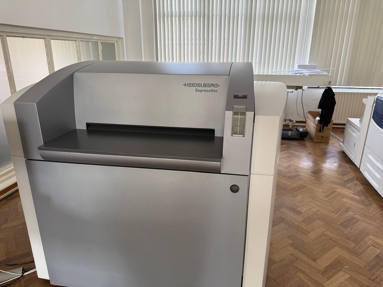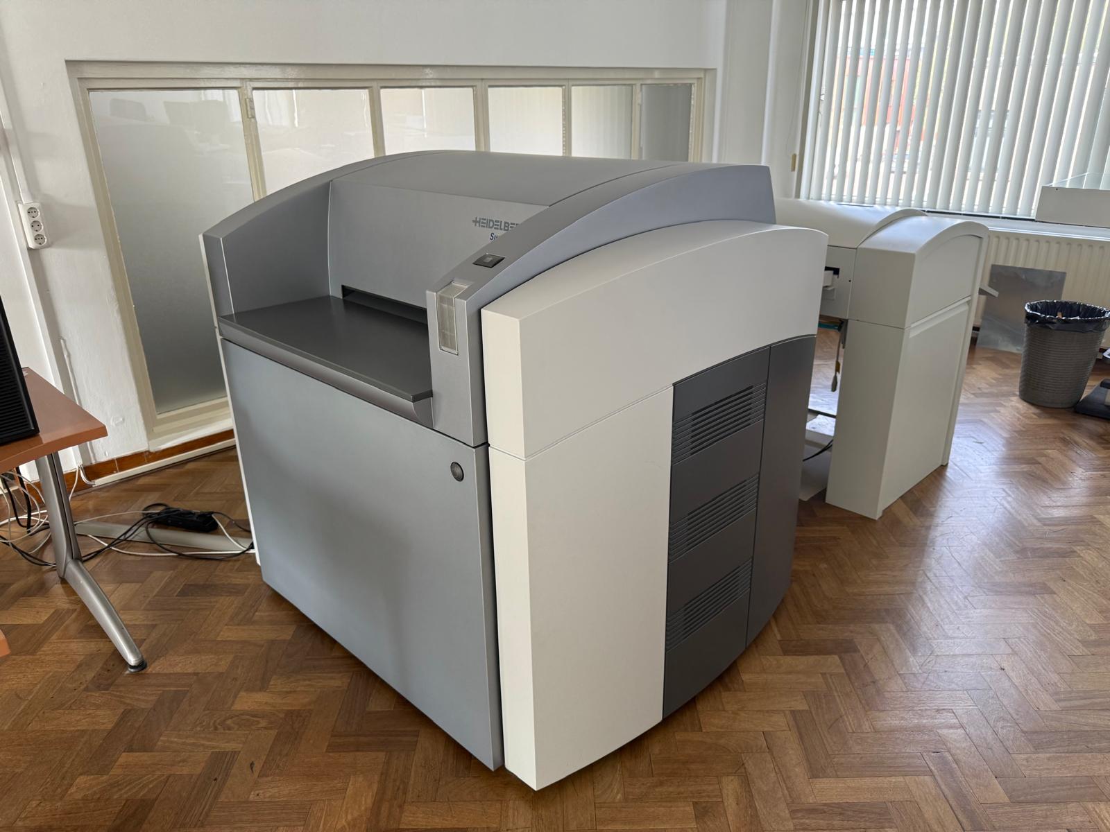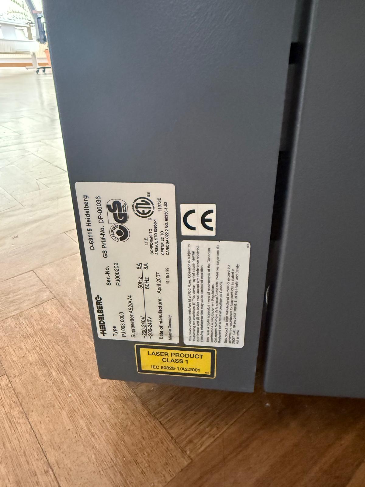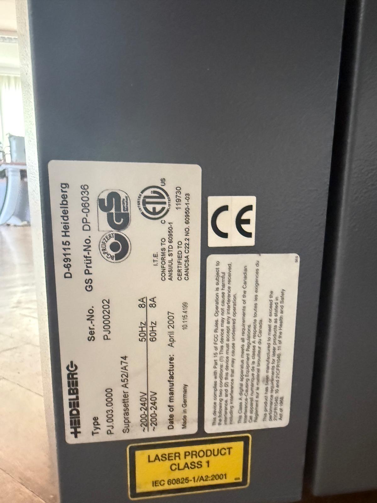 The Heidelberg Suprasetter A52/A74, produced in 2008, is a semi-automatic thermal Computer to Plate (CtP) system designed for high-quality plate production. With a plate size capacity of 670 x 740 mm, this unit is currently in operation at a printshop in Germany. The system is integrated with the Prinekt Workflow, including modules such as Prinect Meta Shooter, Prinect Meta Rip, Prinect MetaDimension, and Prinect Signastation, as well as PDF Toolbox for streamlined prepress processes. Key features include manual plate loading and automatic plate unloading, a Glunz & Jensen C&5 rubberizing unit with plate stacker, and a TECHKON SpectroPlate printing plate measuring device for precise quality control. The machine also benefits from annual major maintenance by Heidelberg, ensuring reliable performance. The serial number for this unit is PJ000705.