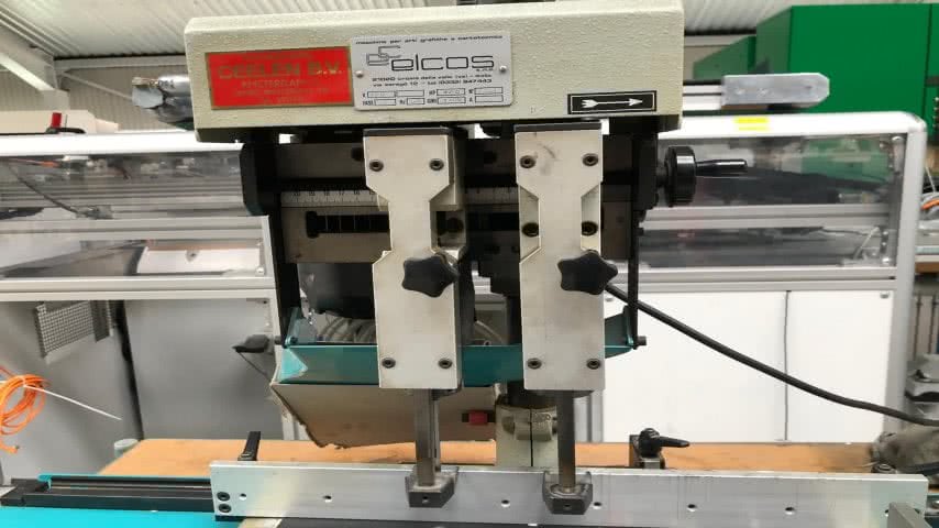• Elcos 2 cabeza máquina de perforación es una máquina fabricada por Elcos en 1992, con un formato de 45 x 150 mm. Actualmente almacenada en Alemania, cuenta con una distancia de perforación de 45 - 150 mm, un espacio detrás de las cabezas de perforación de 100 mm, y es una perforadora de papel de doble cabeza. Opera con una palanca y es monofásica de 240 voltios. Los términos de entrega son FCA.