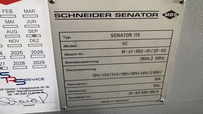 • The Schneider SENATOR 115 SC, manufactured in 2003, is a high-quality machine with a serial number of 11-41-002-01/20-03 and a size of 1150 mm. Currently dismantled and located in Germany, this machine is designed for precision and efficiency. The SENATOR 115 SC comes equipped with a program for automated operations, ensuring ease of use and consistent performance. It features photocells for accurate detection and control, enhancing its operational capabilities. Additionally, the machine includes an air table for efficient material handling, making it a reliable choice for various industrial applications.
