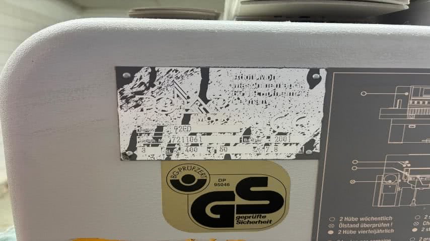 • This machine is a Polar 92 ED, manufactured in 2001, with the serial number 7211061. It is designed to handle a size of 920 mm and is currently in stock in Germany. The price is available upon request. The machine is in good condition without any damages. It features side tables with air on the left and right, a monitor screen, and ED program control. The table surface is stainless steel-plated, measuring 72 x 87 cm.