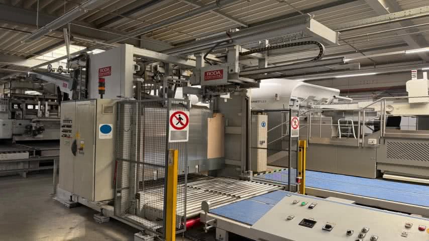 • We present this ASAHI CARTONMASTER AP 1600M-III FLAT BED DIE CUTTER, 1100mm x 1600mm / 43" x 63", complete with RODA Prefeeder, 2 CORPART Printing Units and QE Bundle Breakers, manufactured in 1991. The machine is in very good condition, in production, can be inspected at any time and is immediately available.